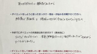 スマートフォンでダイエットについて検索されて、当院のホームページが出てきて、卒業された方の写真や体験談を見られて、どうして耳つぼダイエットで痩せられるのかを詳しく聞きたいということで、ダイエット相談にお越しになられました。