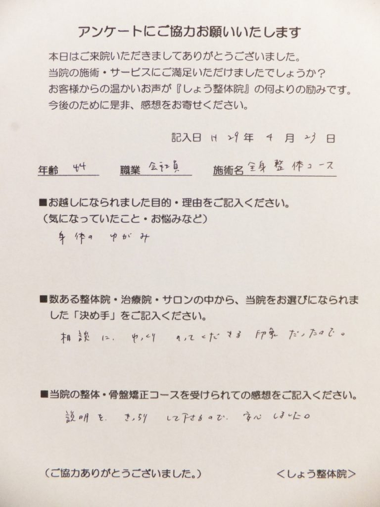 【全身整体コース】三田市在住 44歳 女性(会社員)「身体のゆがみ」でお越しになられました。