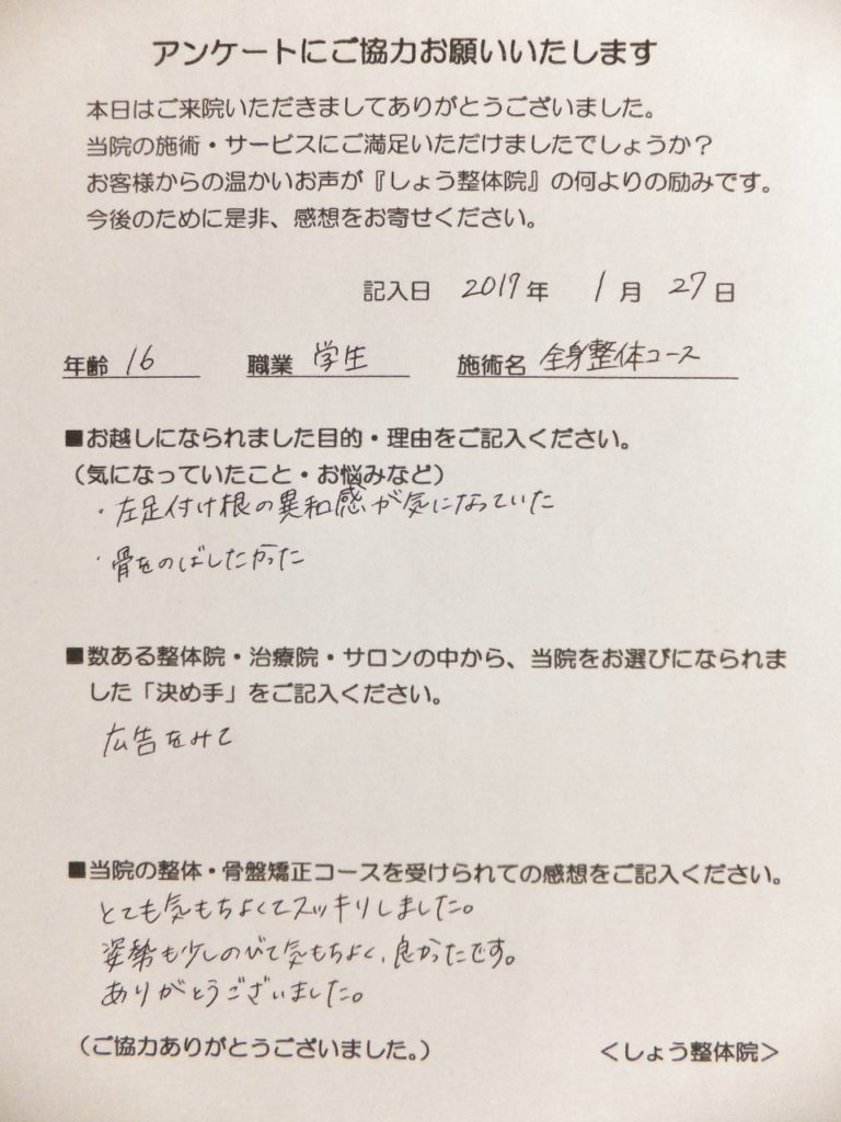 「左脚の付け根の違和感、カラダの歪みが気になって...」でお越しになられました。