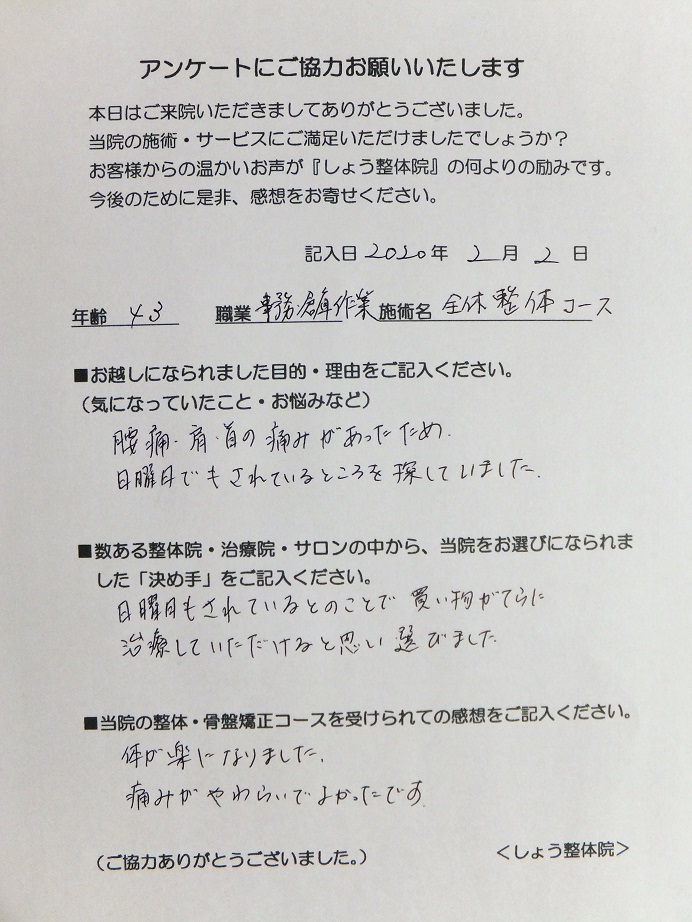 施術後は、気になっていた動作や姿勢もやりやすくなりお悩みも軽減されたようでした。