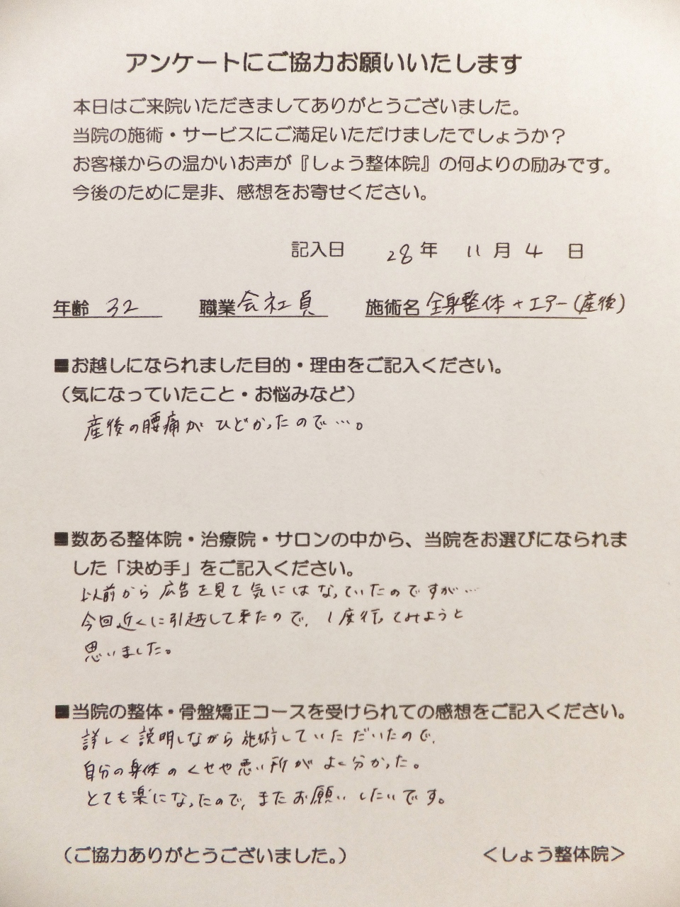 「産後の骨盤矯正、腰の痛み」でお越しになられました。