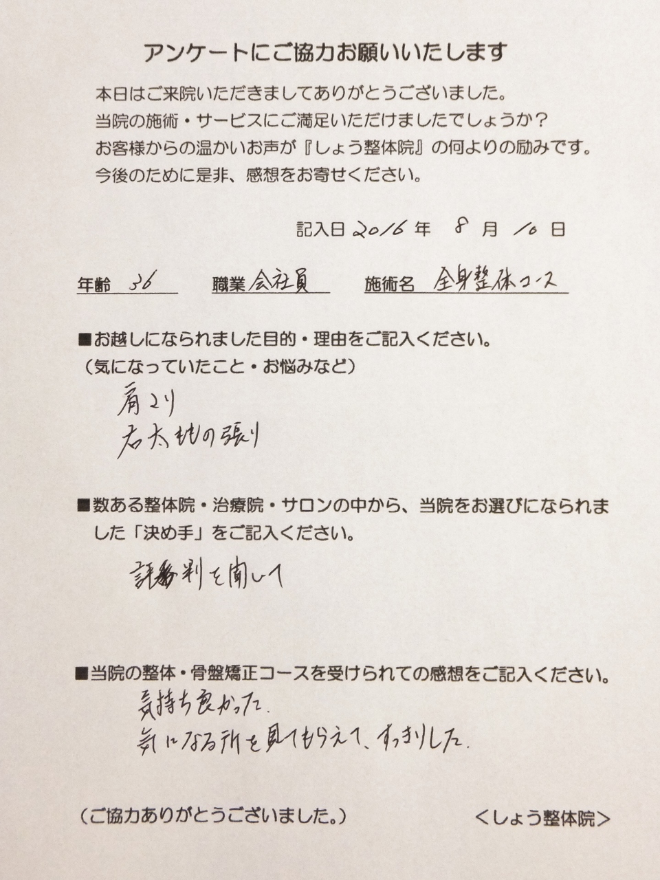 お客様の声・口コミ(整体・骨盤矯正)【全身整体コース】