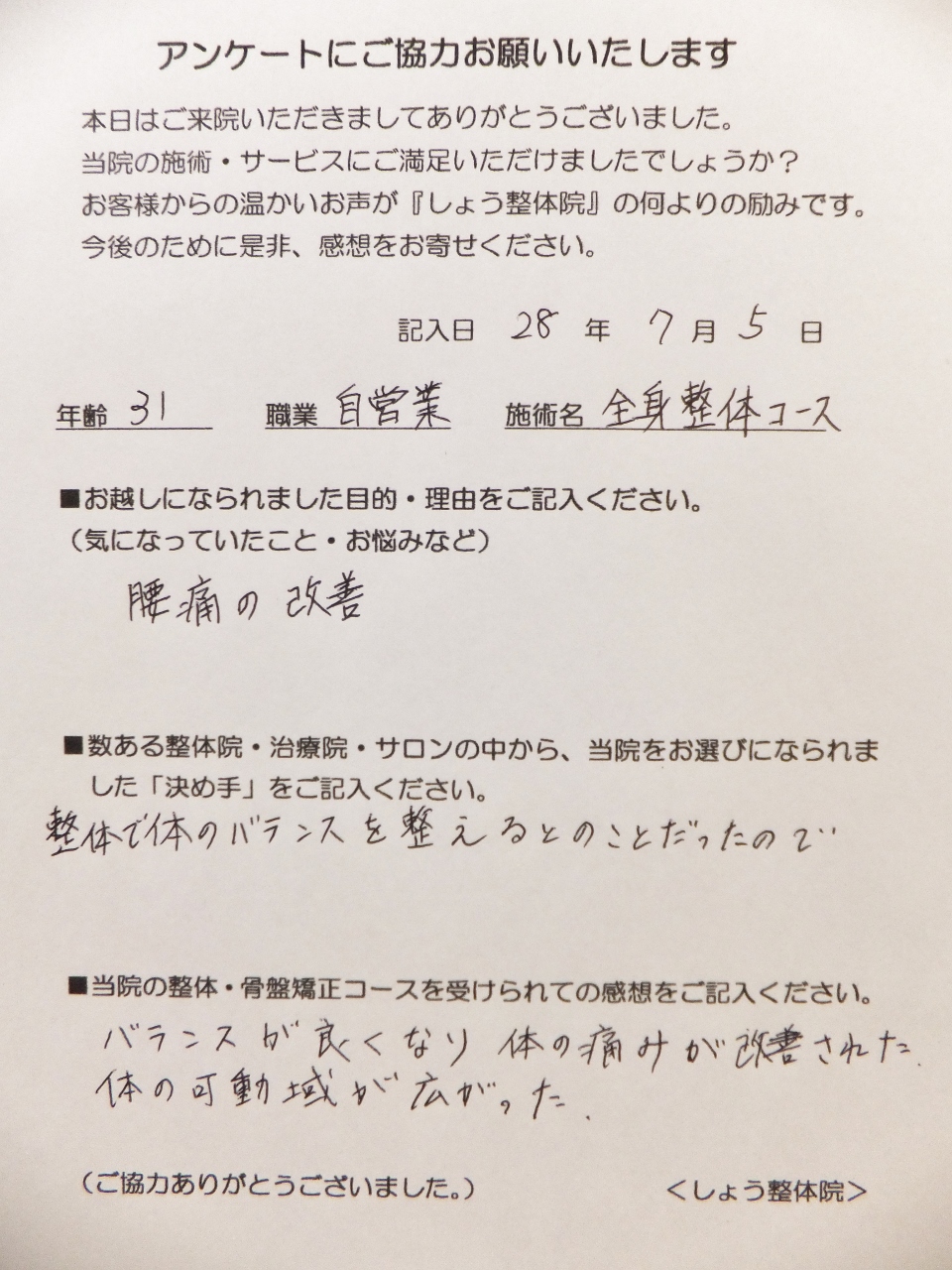 「カラダのゆがみをチェックするため、腰痛改善のため」にお越しになられました。