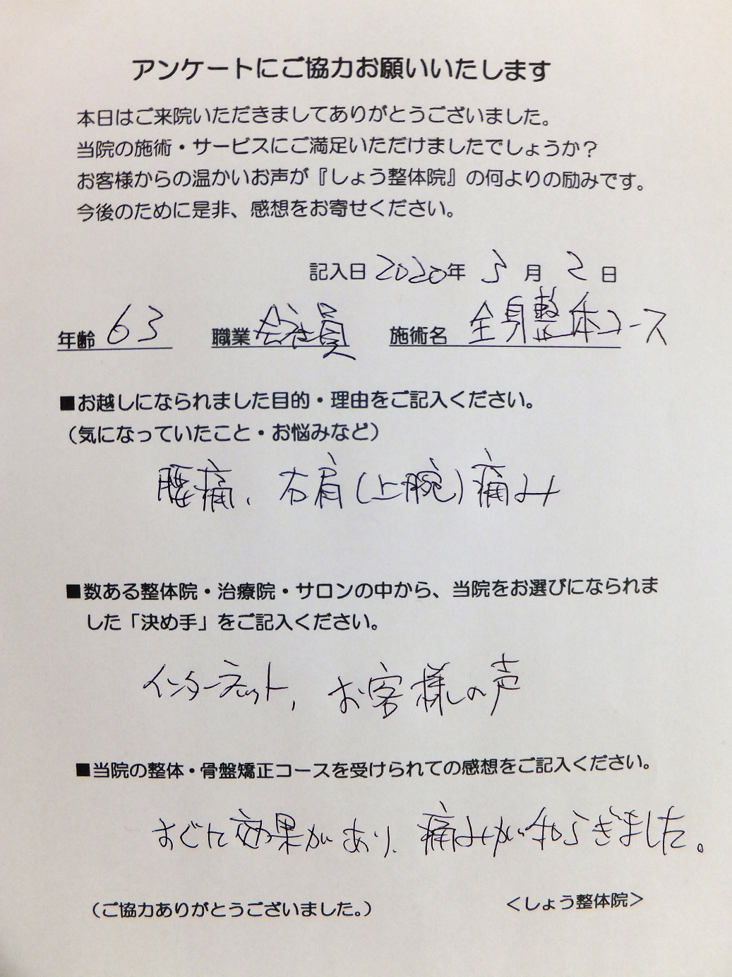 立ち上がる時や右足を上げる時の腰の痛み、右肩を後ろに動かすときの上腕の痛みでお悩みでした。