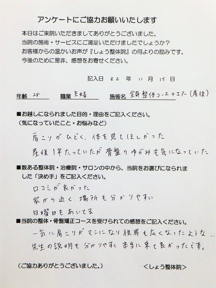 肩こりがひどく、産後一年ぐらいで尾てい骨の痛みもあり、産後の骨盤矯正も気になってお越しになられました。