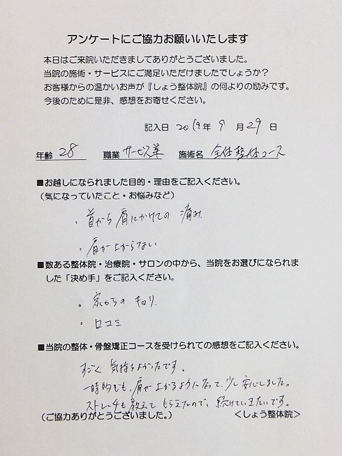 施術後は、肩を横から上げる動作もスムーズになり安心されていました。