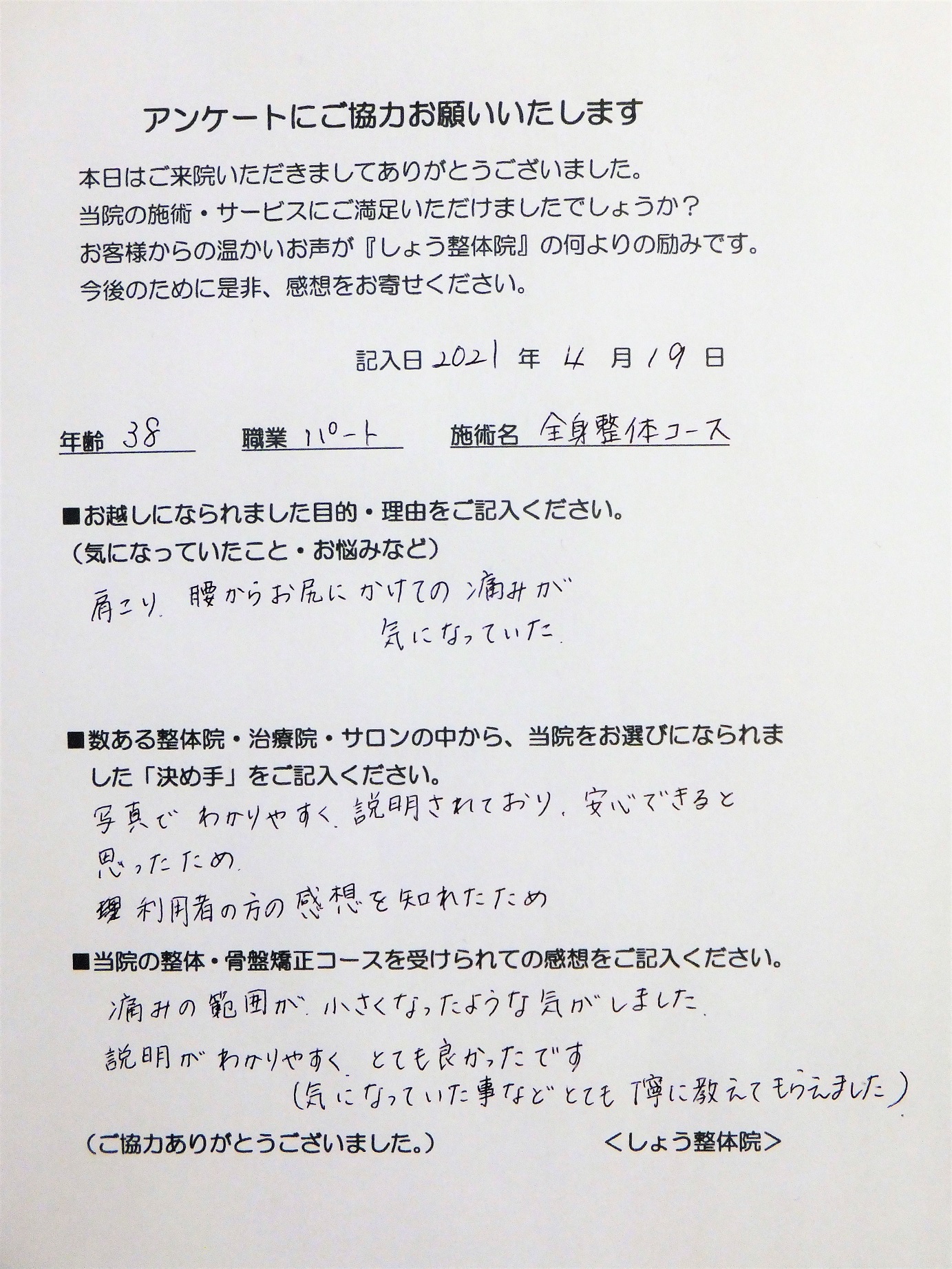 肩こり、腰からお尻にかけての痛みが気になっていた。