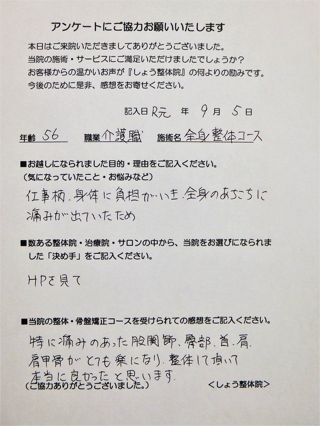 特に痛みのあった股関節、臀部、首、肩、肩甲骨がとても楽になり、整体していただいて本当に良かったと思います。