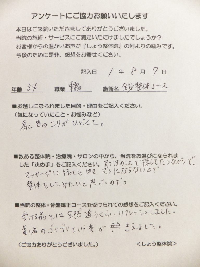 デスクワークのお時間が長く、首・肩が重だるくなってきて頭も重たくなってきたとお悩みでした。