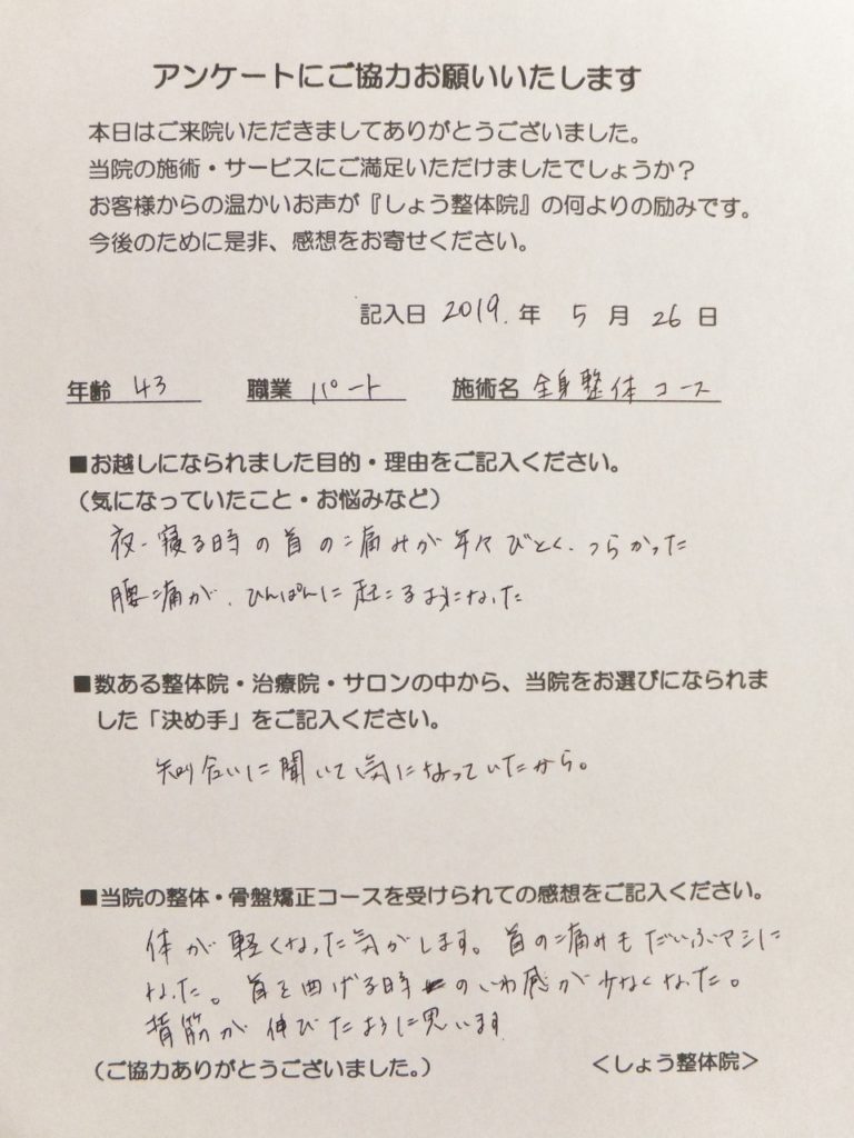 施術後は首の可動域が大きくなり、ラクなったと言われていました。