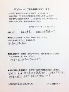 施術後は首の動きも良くなって、動かしやすくなられて喜ばれていました。