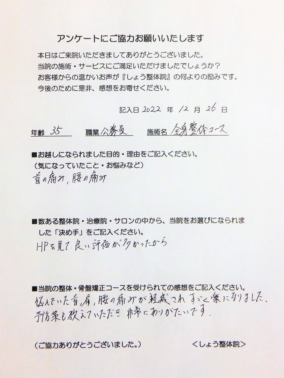 ■当院の整体・骨盤矯正コースを受けられての感想をご記入ください。